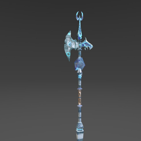 Lastly I created the arctic staff that I designed to be more aggressive in appearance to reflect the environment it was located in. I designed it as a halberd/wand hybrid to show how the previous user was more of a warrior to the other wizards in the world. I took design ideas from the other staffs specifically the colouration of the wood reflecting the trees in the area, crystals with emissives showing the magic power in the staff and how the environment has affected the staff with ice from blizzards covering the entire staff in ice and snow. I also designed the blades of the axe to look like blocks of sharp ice to show how the biome has affected the design of the weapon in universe.