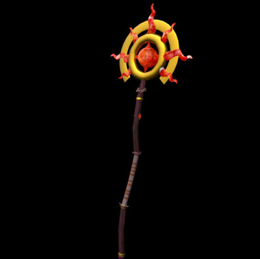 The sun staff was the next model I created, originally it was the volcano staff but I changed it for reasons ill explain in a bit but at first I took inspiration from some of the volcanic biome team's props mainly for the design and colouration of the wood and crystals. When modelling and texturing this modelling I was taking inspiration from other games that were normally labeled sun staffs and the design of the model already looked like a sun. From this I got the idea to look around the discord channel for anyone making an astral observatory and by some luck there was someone doing one so I changed the name of the model to the sun staff and started another substance file to create the moon staff. The idea in my head was that if there was people looking into the celestial bodies the mostly common people would be wizards so they would carry around staffs that represented their connect to their subject of research just like how a wizard from the woods would use a staff made of wood.